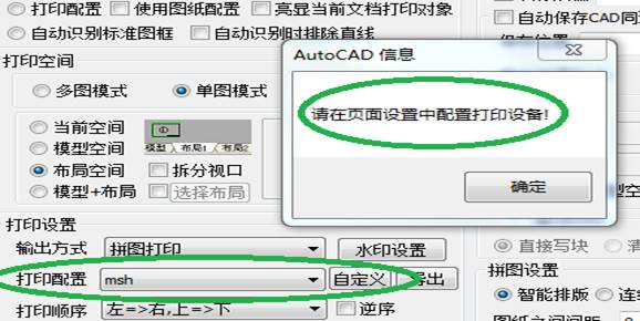 3. 如出现如图4.8.2.2所示,提示请在页面设置中配置打印设备,用户在打印配置中的msh配置中的打印机设备为无,必须点击“自定义”按钮,进行配置。